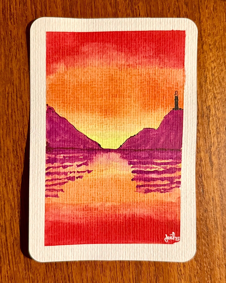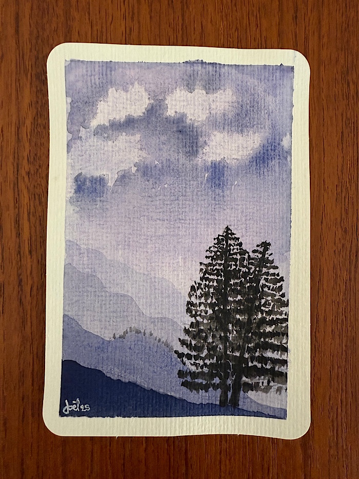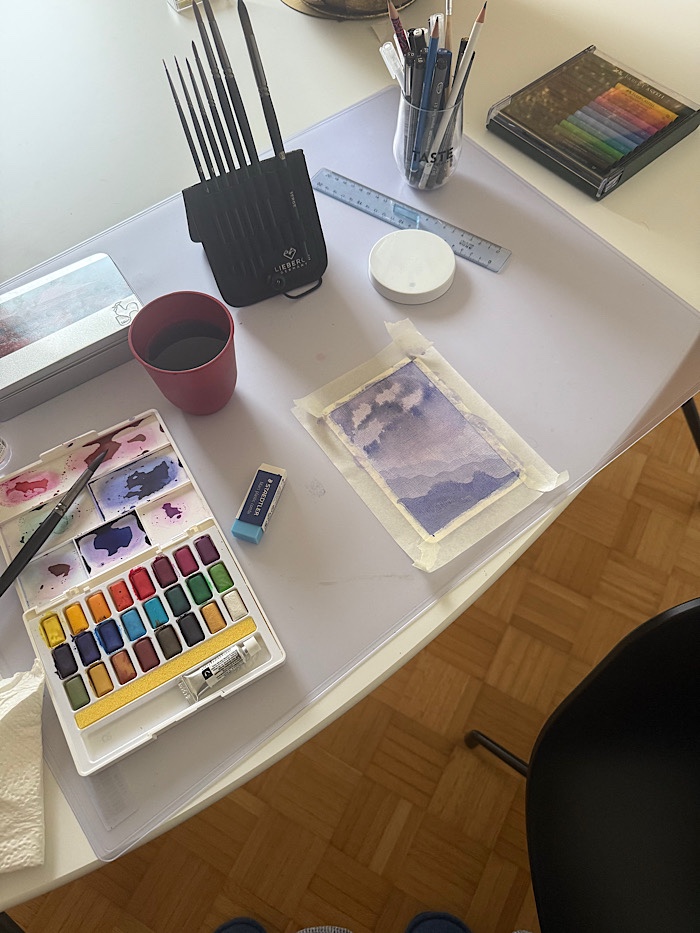 Ich werde mich weiter in Perspektive versuchen. Ich finde hier ist das schon mal nicht schlecht geworden. Auch das mit den Wolken ist fast ok. Ich traue mich immer noch nicht mit der Nass-auf-nass Technik einfach loszulassen und die einfach Farben laufen zu lassen. Ich wünschte ich hätte darüber mehr Kontrolle. Üben,üben,üben…
