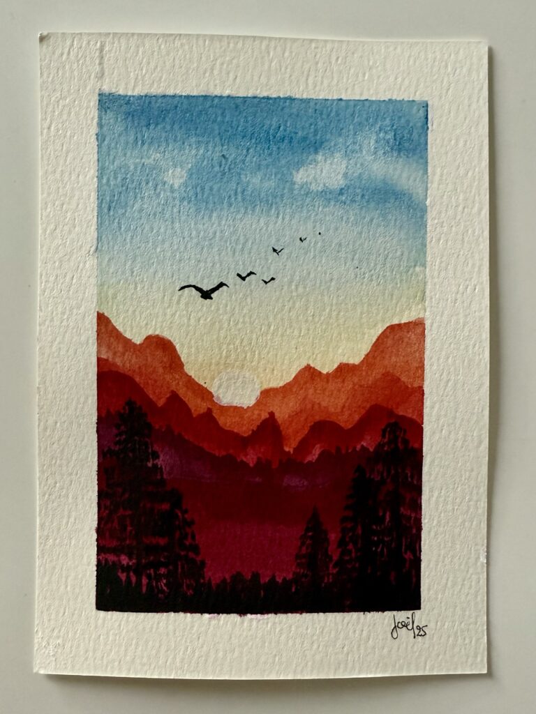 Die Tannen werden langsam besser, und ich fragte mich ob man im Aquarell die gleiche Technik wie Bob Ross in der Ölfarbe anwenden kann, nämlich die Tannen mit dem Fächerpinsel malen? Das neue Aqurellklebeband ist auch nicht sooo toll. Es ist jetzt schmaler, so wie ich es haben wollte, aber es suppte doch an man Stellen durch.