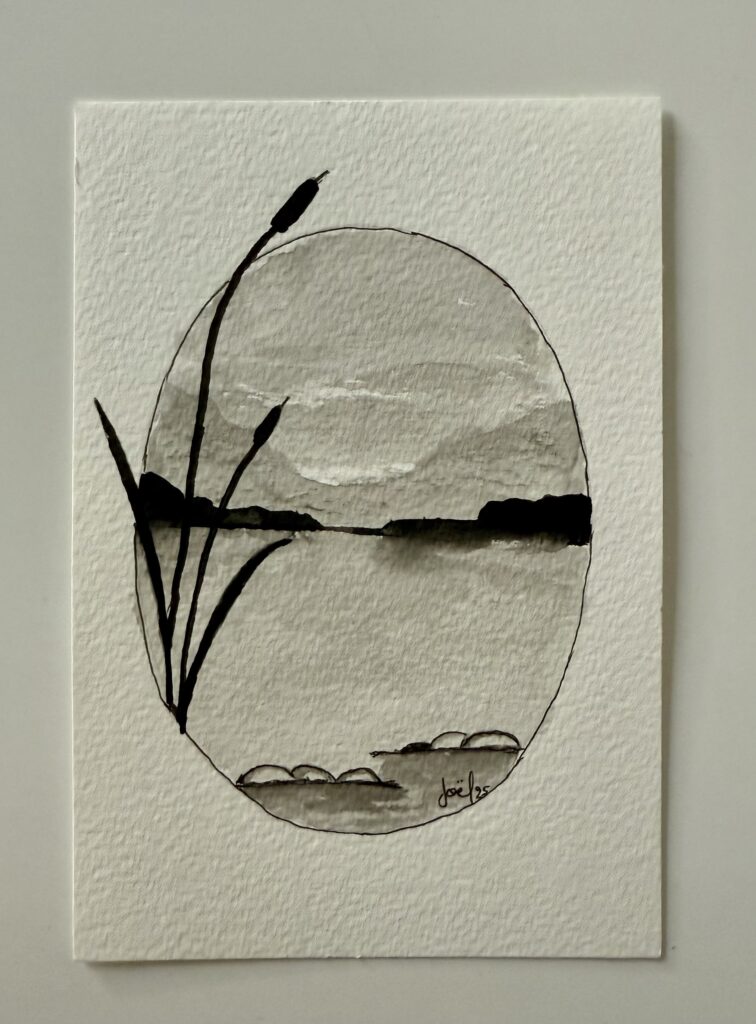 Der Horizont ist nicht ganz grade, ansonsten mag ich das Bild sehr. Ich habe nur mit Schwarz gemalt und der Verdünnung mit Wasser. Das nöchste mal probiere ich das Grau selbst anzumischen mit Blau, Rot und Gelb. Auch die Steine im Wasser vorne sehen aus wie Maulwurfshügel. Gibt es Seemaulwürfe?
