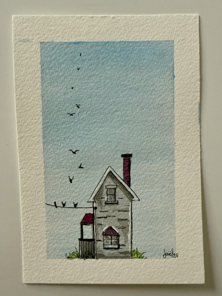 Von den Motiven her sind es Variationen von Bildern die ich schon mal gemalt habe, aber es geht ja auch ums Üben. Hier ging es mir um die Ratio von Farbe und Wasser so wie im obigen Bild auch. Schatten, wie z.B. der vom Giebel muss schon sehr präzise sein, sonst verpufft die Wirkung. Die Mini Details habe ich mit einem Pigmetstift hinzugefügt.
