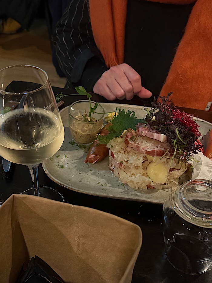 Die Gerichte sind alle etwas heftiger und luxemburgischer. Für mich gab es Blutwurst und für mein Gegenüber Choucroute.