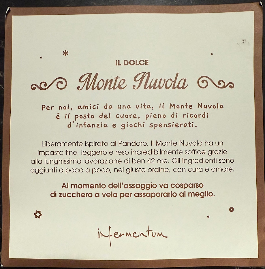Frei nach dem Vorbild des Pandoro hat Il Monte Nuvola einen feinen, leichten Teig, der dank der sehr langen Verarbeitungszeit von nicht weniger als 42 Stunden unglaublich weich wird. Die Zutaten werden nach und nach, in der richtigen Reihenfolge, mit Sorgfalt und Liebe hinzugefügt. Zum Zeitpunkt der Verkostung sollte man ihn mit Puderzucker bestreuen, um ihn in vollen Zügen zu genießen. (Was ich aber nicht getan habe) Es ist also kein Panettone.
