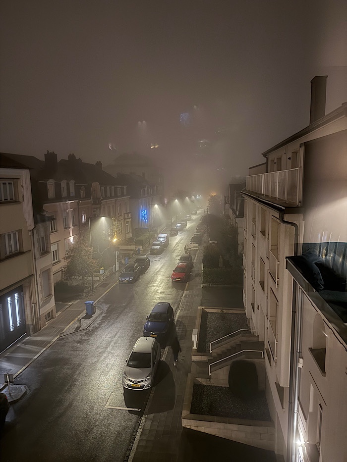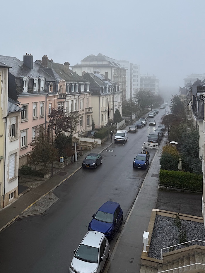 Daheim nich mal ein letztes Foto der Straße, die immer mehr im Nebel verschwand.