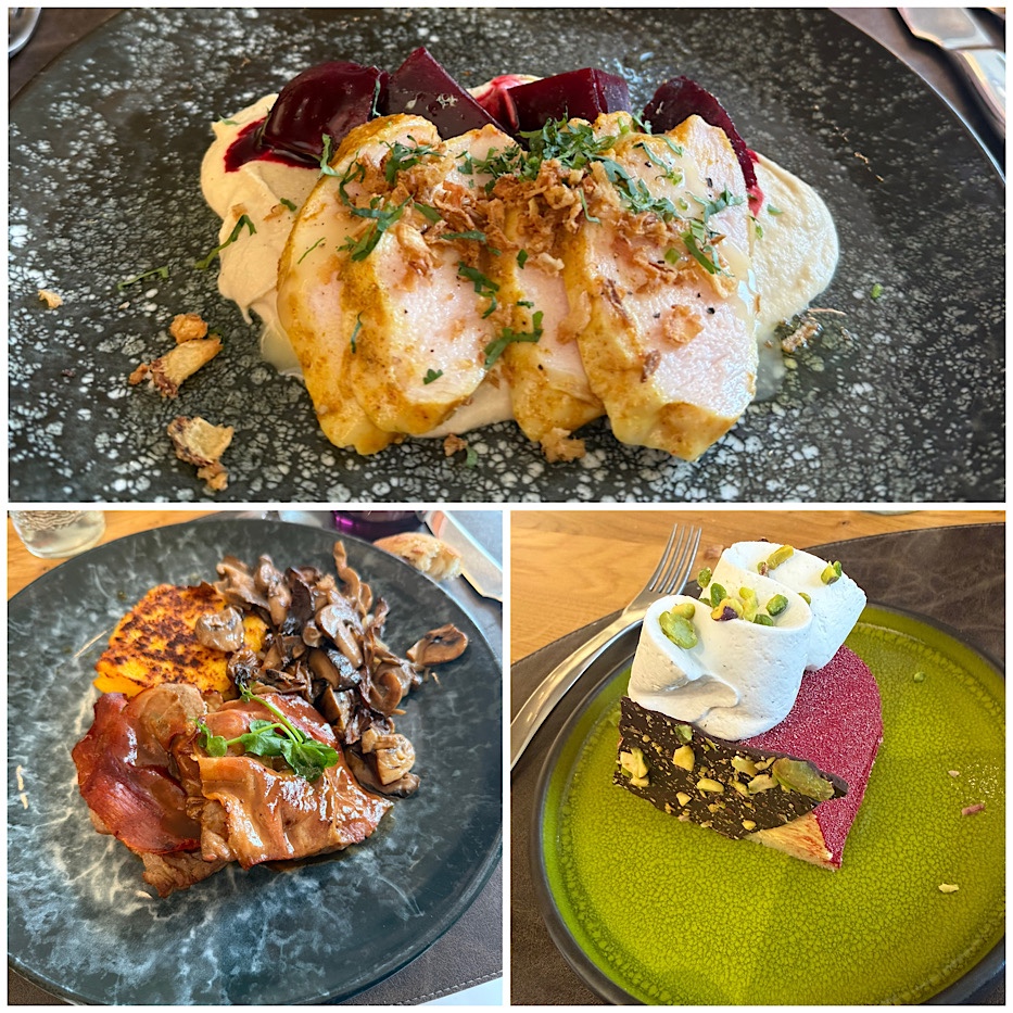 Das Wochenmenü bot als Vorspeise Hummus mit klatem Hühnchen und roter Beete, als Hauptgericht Saltimbocca mit Polenta und als Nachtisch Bûche de Noël mit Mango. Wunderbar.