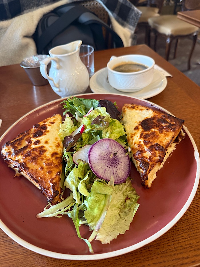 Ein Croque Monsieur. Danach war mir wieder einigermaßen warm und ich wanderte eine Runde durch das Zentrum von der Stadt. Außer ein paar wenigen Restaurants und Konditoreien, war alles geschlossen. Vielleicht sollte ich noch erwähnen, dass Miromont ein richtig teurer Laden ist! Mit zwei Tassen Kaffee kostete das ganze satte 30 €! Kurz nach 14:00 nahm ich den Bus zurück.