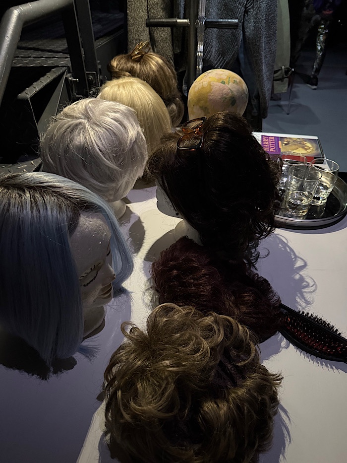 Ab Abend dann eine Dienstrunde die sehr schön war, aber auch sehr anstrengend und das werden die nächsten Dienstrunden insgesamt. Das Foto unten zeigt einen der beiden Tische auf der Hinterbühne. Man sieht viele Perücken. Das ist nicht ganz die Hälfte der Haarteile, die in diesem Stück zu Einsatz kommen.