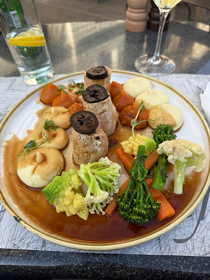 Heute gab Hüchnchenroulade mit zweierlei Püree und allerlei Gemüse und einem Protwein Jus. Sehr gut.