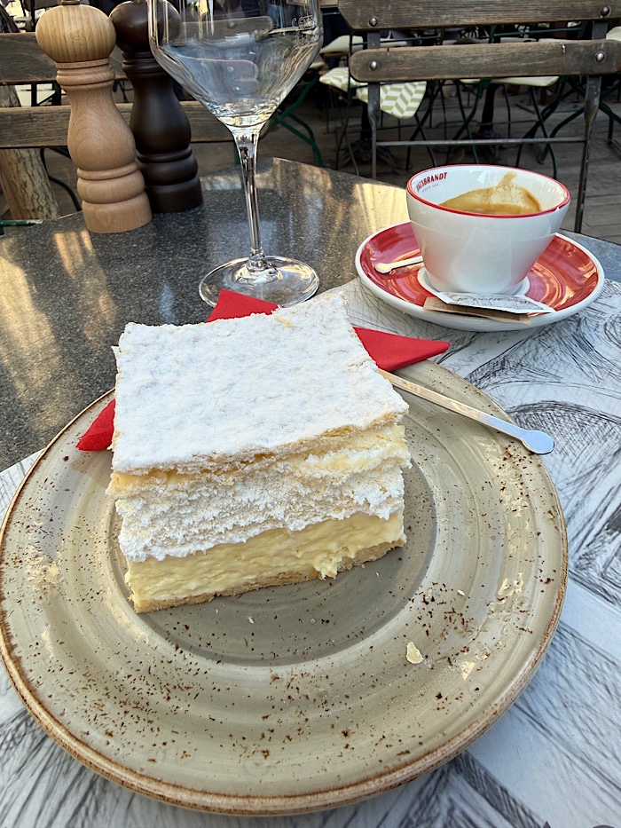 Und da noch Zeit war bis ich wieder im Theater antreten musste und irgendwo sicherlich nich ein Nickerchen passte, gönnte ich noch einmal eine Kremšnite, weil ich das daheim nicht nochmal so schnell bekomme. Im Prinzip ähnelt es einem französischen Mille Feuille, der in der Muckibude war.