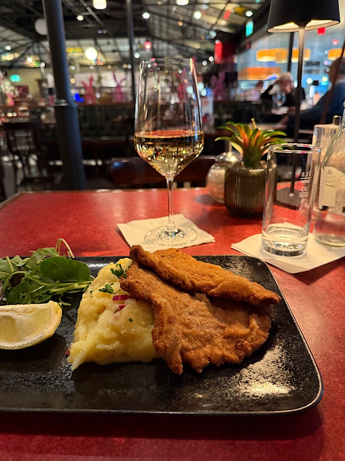 In München, dann hatten wir satte 4 Stunden Aufenthalt. Ich hätte das tun sollen was die anderen auch taten, nämlich rausgehen und nicht im Transitbereich bleiben. Aber okay ich wollte ein bisschen schreiben ich wollte ein bisschen am Podcast schneiden, den ich ja mitgenommen hatte, tat ich aber alles nicht. Ich gönnte mir ein Mittagessen bei Käfer. Ein Wienerschnitzel und ein Tartufo mit Pistazien.