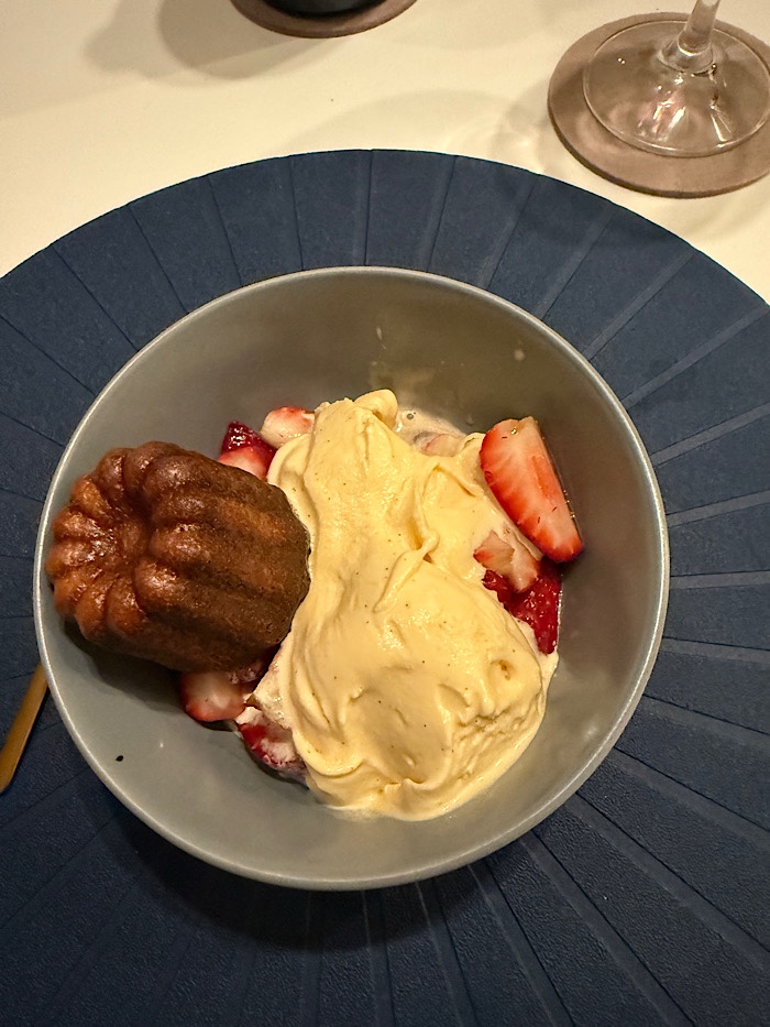 Zum Nachtisch gab es dann frische Erdbeeren mit einer Kugel Vanilleeis, das leider noch nicht ganz fest durchgefroren war.