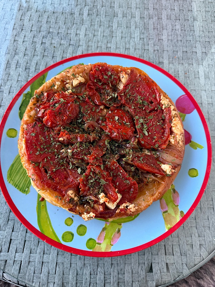 Ich kaufte den Blätterteig und fuhr anschließend gleich zurück. Ich hatte vor eine Tarte Tatin zu machen, die ja bekanntlich kopfüber gebacken wird. Allerdings machte ich sie nicht mit Äpfeln, sondern die salzige Variante mit Tomaten.